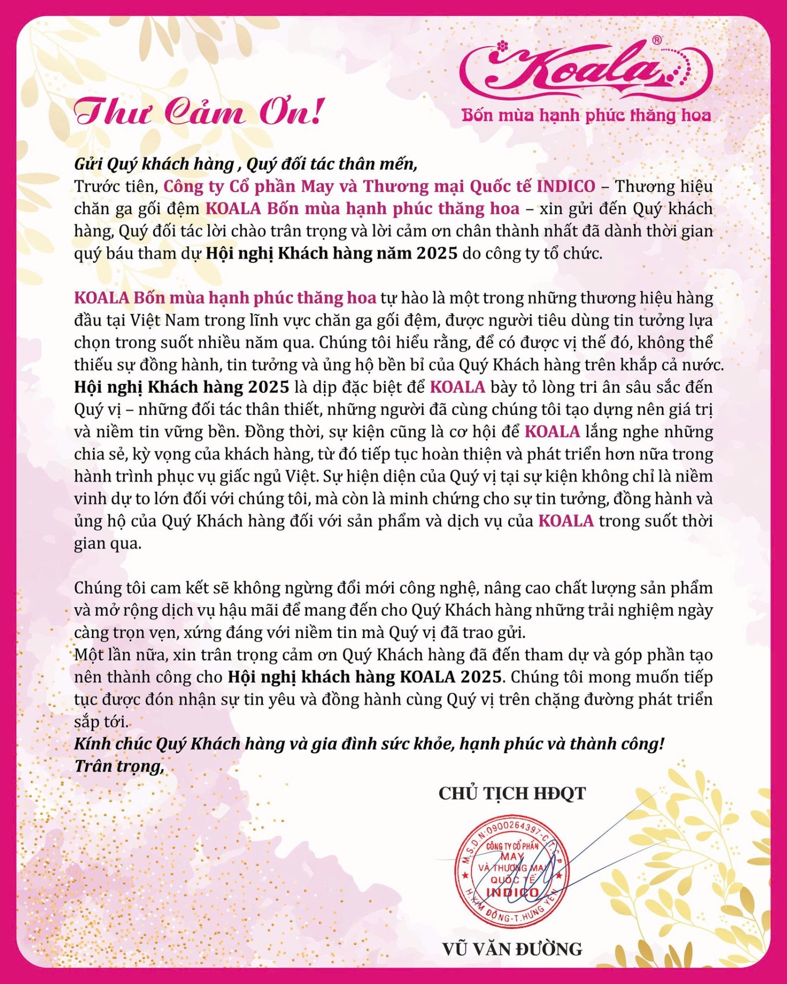 Trong không khí ấm áp và đầy cảm xúc của Hội nghị Khách hàng 2025, Công ty Cổ phần May và Thương mại Quốc tế INDICO – thương hiệu chăn ga gối đệm KOALA – Bốn mùa hạnh phúc thăng hoa xin gửi lời tri ân sâu sắc đến Quý khách hàng và Quý đối tác đã dành thời gian quý báu tham dự.